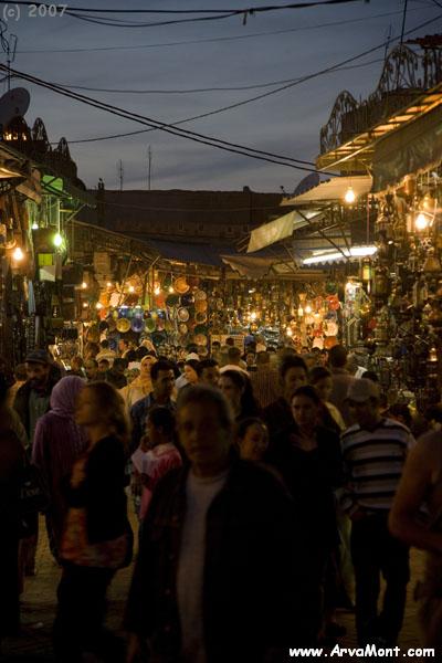 By night, the La Place is converted into an outdoor party. Portable restaurants are set up where, during the day, there was nothing but open space! Each is grilling something tasty, the smoke obscuring the scene.. The daytime crowd seems to be largely tourists and those catering to them. The evening crowd is locals. The story tellers come out and you see huge circles of men listening to them, enthralled. People veiled and masked to unveiled all mingled together enjoying the cool of the night. The party seems to break up around midnight. By morning, the tables, grills, chairs and other evidence of the evening's activities have been put away!