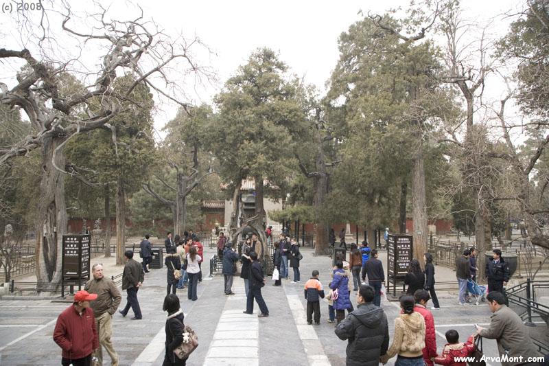 Passing through the Gate of Heavenly Purity to come to a Hall used as a throne room and bridal chamber. ^ Behind this hall, still on the north-south axis, but now at the very back of the Forbidden City, is the Imperial Garden. It has some interesting features. We liked the trees that were pruned to take on the shape of an arch. I believe they were attempting to take on the shape of a Chinese character that looks a little bit like a lambda: λ, which means man. There are four of these on the four sides of a shrine.^ The Hill of Accumulated Elegance. Also in the inner court were 26 separate halls, one representing each province in the land. It is in these halls that the Empress and the various concubines lived. By the time we reached the back of the Forbidden City we were too tired to tour each of these, so we just visited the courtyard commanded by Cixi, the last Empress Dowager.
