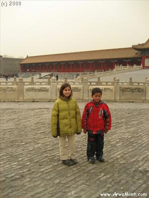 We had just crossed over one of the five bridges over the Golden Water when a woman approached us and asked if she could take a picture of her son with ours. < Here he is. (Since Yannis' hair has gotten quite long, people have started guessing that Anika may be a boy, with long hair like his father. Perhaps it is her boyish clothes or her rebellious nature? More likely, it would be extremely offensive to call a boy a girl!) The most important buildings and courts are along the central North-south axis. They all face south to honor the sun. We passed around the Gate of Supreme Harmony, which was covered in scaffolding, to see the most important building in the Forbidden City - the Hall of Supreme Harmony. You can tell it is the most important, because the buildings have a visual ranking system - the number of animals at the roof corners. The more animals, the more important the building. The Hall of Supreme Harmony was 11.
