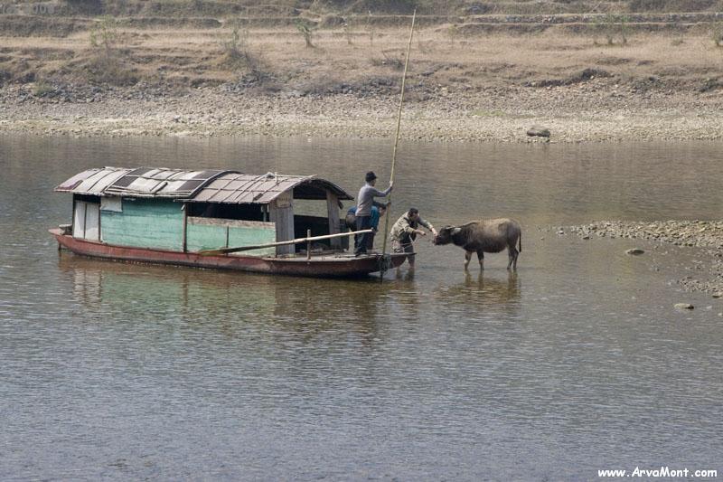 These are traveling salesman, targeting our boat. Look, these boats are large enough for an entire family! Good thing China has a one child policy. ^ This was a strange sight! The fellows on the right were having a bit of a stand off with this bull. They thought he should follow them into the water. He seemed to have other plans. By the time the trio was out of sight, it was not clear who would win this battle of the wills, though my money was on the ornary bull! Tasha and Anika knew right away what was going on with these birds sitting on the log (right image). They are cormorants, kept as captive fishers. They catch some of the most desirable fish and bring them back to their owners. Due to a ring around their necks they are unable to eat the fish themselves. Their owners feed them mashed up fish at the end of the day. Strange idea, huh?
