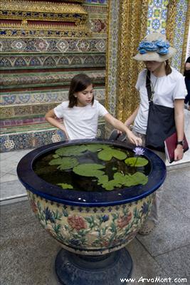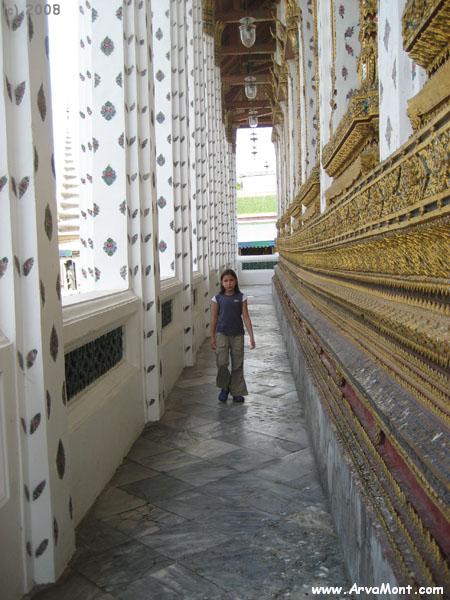 As we wandered through the temple looking at the front of the reclining Buddha we were aware of a strange clanging noise emanating from behind him. We thought "Bells?" When we got there we saw that people were placing coins into 108 metal buckets. (Conveniently, you could acquire these coins from a monk right there.) Wat Arun - The Temple of the DawnWat Arun is located on the other side of the river from Wat Po. We took a ferry across, which cost us 3.5 baht each - about 44 ¢ in total.Again there is a whole complex around the holy shrines. This wat is made up of Khmer-style towers called prangs, covered in broken china, which was supposedly used as ballast on ships from China. Once again, there is lots to catch your eye.