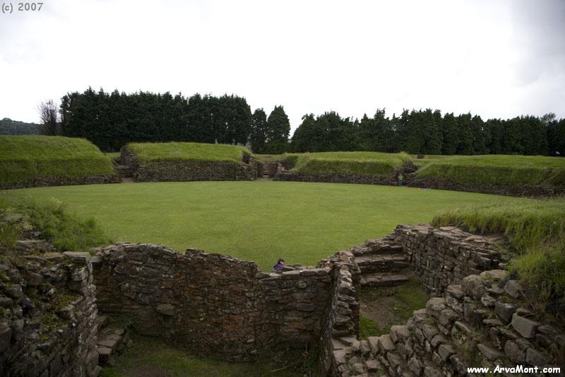 This old Roman amphitheatre sits unassumingly next to a farmer's field. It was built in 90 A.D. and used until the Romans withdrew in 290 A.D. It had an excavated center, and the dirt banks were used to support the first several rows of seats. Additional seating was constructed of wood, and would have been huge - they estimate that more than 6000 people could watch the activities in the Amphitheatre.