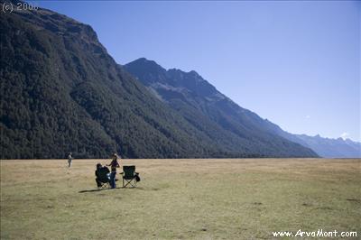 The road to Milford is a long, windy one, which travels up into one of the passes, through a downhill tunnel of a little more than a kilometer and then back down to sea level. Along the way we were treated to some spectacular scenery. After driving up, up, up for a while, we came to this beautiful wide clearing, clearly carved by a glacier. The kids wandered off to explore the tree fall on the other side of the clearing, not realizing just how far away it was or that there were two streams to cross to get there. They were gone so long, Yannis and I had a chance to try out our chairs. Then we thought we might entice them home by flying our Chinese kite. Unfortunately, the kite seemed to attract a busload of tourists instead, and still no kids.