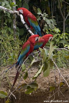 this particular clay lick, the parrots and the macaws appear in "shifts" - first